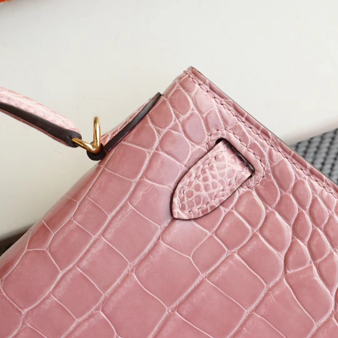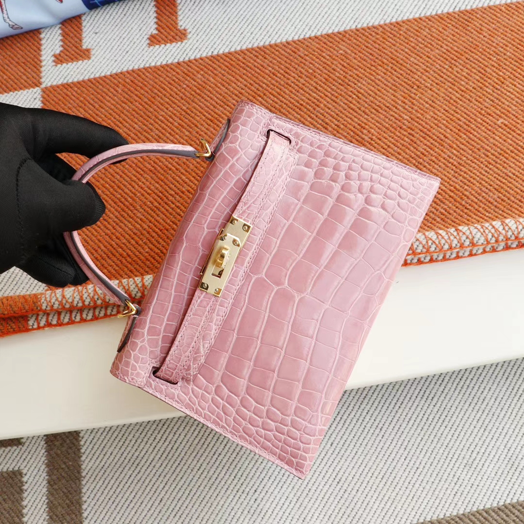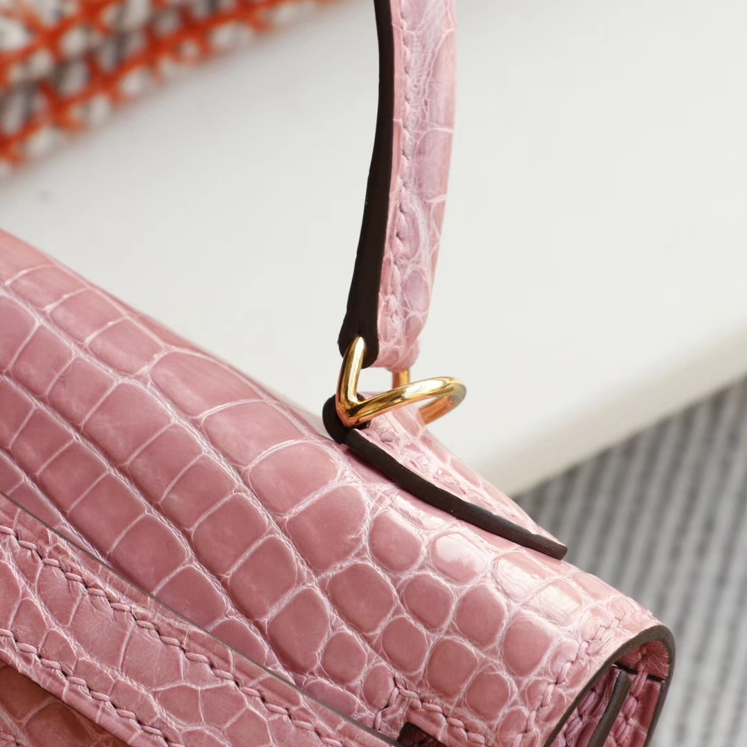 Baiyun Leather City HERMES 3Q Cherry Blossom Pink, Gold Buckle, Minikelly II, Hcp Glossy Crocodile, Pure Hand-sewn Craftsmanship