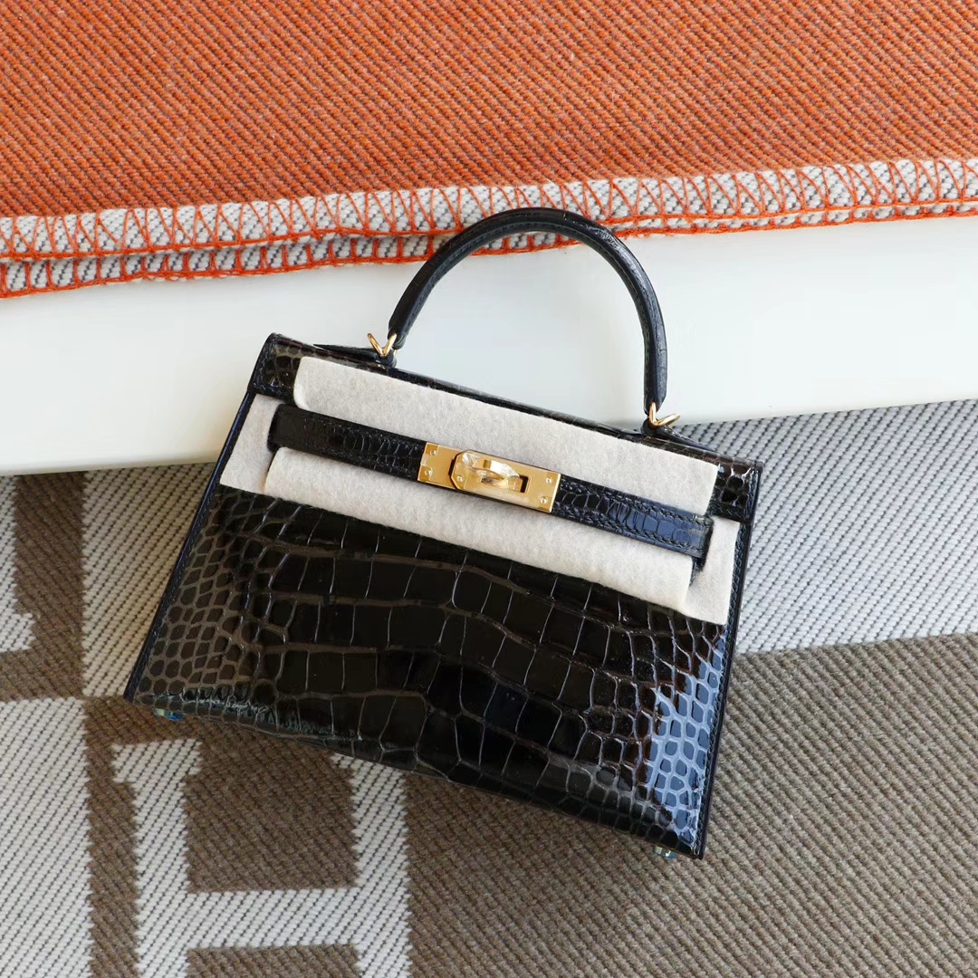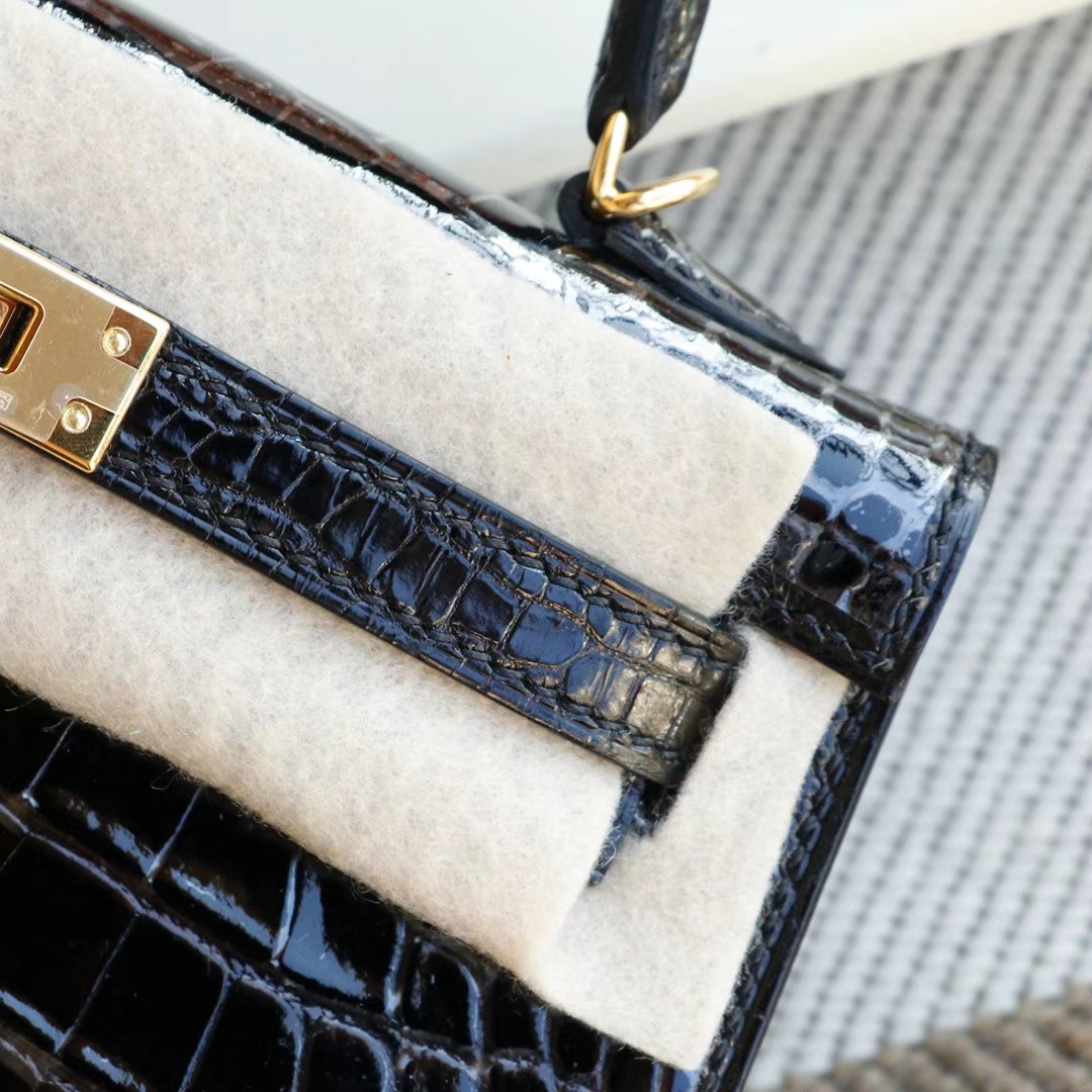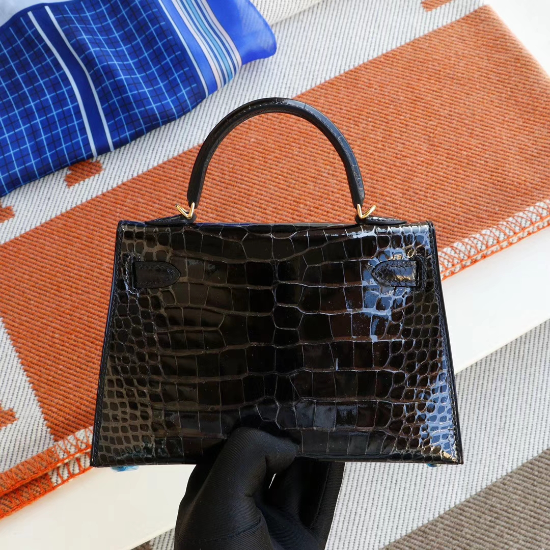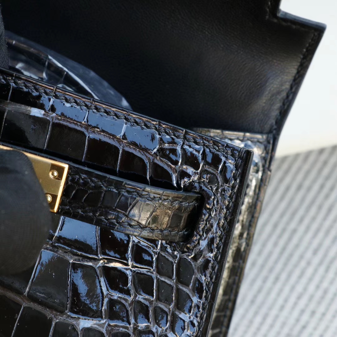 Hermès CC89 Black with Gold Hardware, Mini Kelly II, Hcp Glossy Crocodile, Mini Kelly Bag, Pure Handmade Stitching