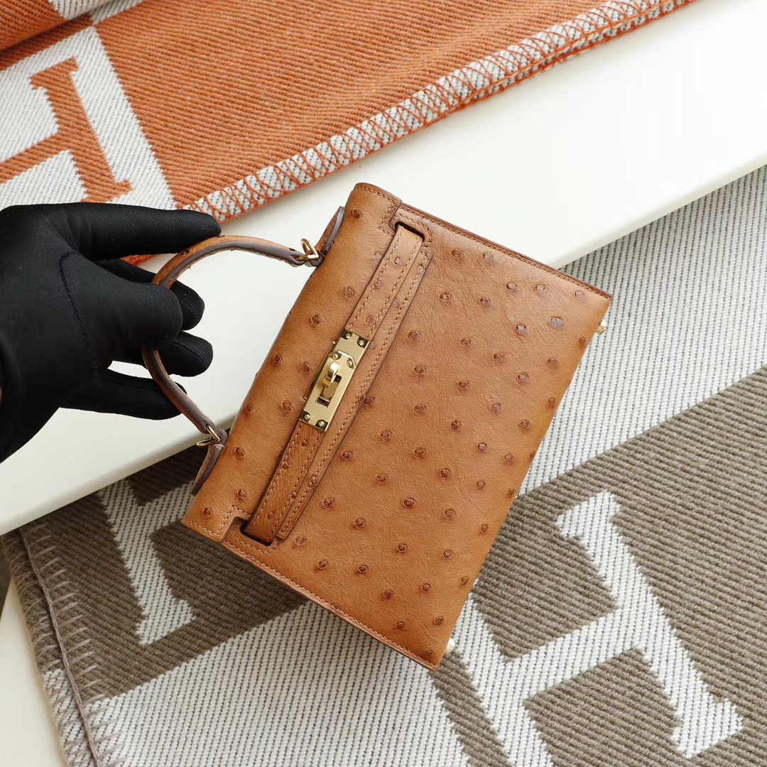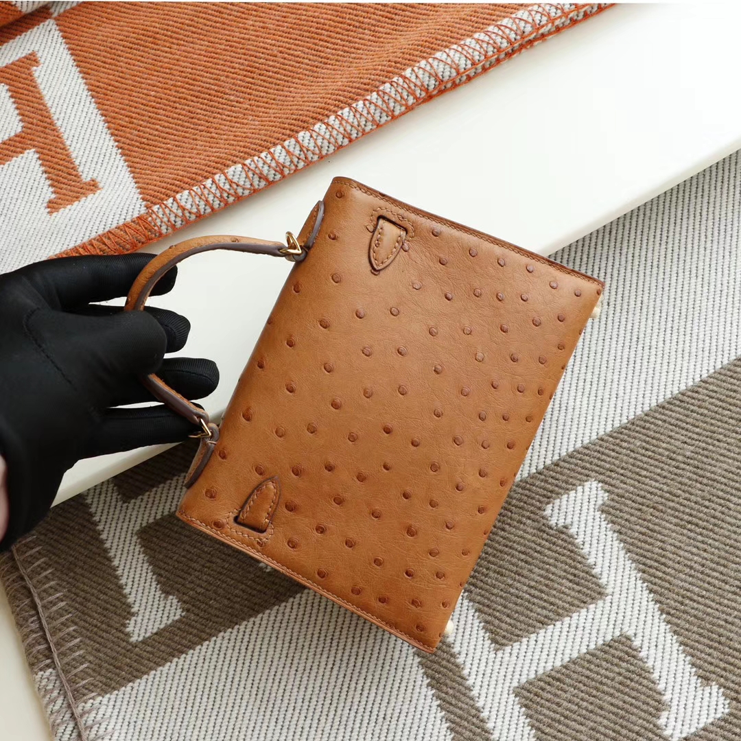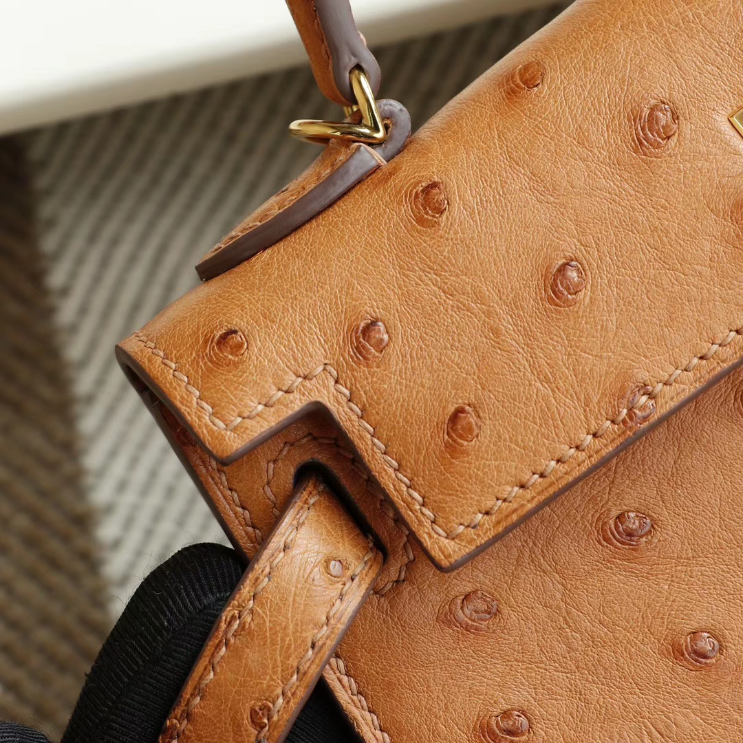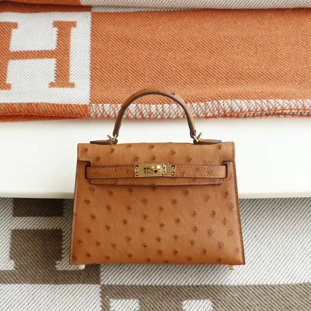 Luxury handbags in Guangzhou - HERMES Ck37 Gold Brown with Gold Hardware, Minikelly II, South African ostrich leather, wax-sewn